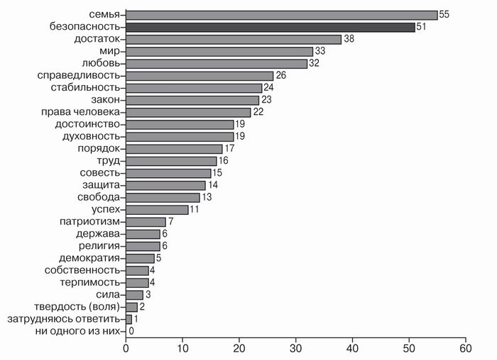 Тем не менее вряд ли можно сомневаться в том, что острый дефицит безопасности не только прискорбен сам по себе, но еще и препятствует развитию любых иных потребностей, а тем более — ценностей: график недвусмысленно иллюстрирует эту нехитрую сентенцию.