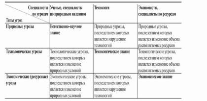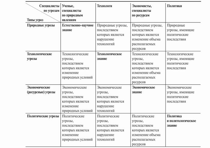 Отношение между строкой «природные угрозы» и столбцом «специалисты по природным явлениям» интерпретируется как «естественнонаучное знание», отношение между строкой «технологические угрозы» и столбцом «технологи» интерпретируется как «технологическое знание», а отношение между строкой «экономические (ресурсные) угрозы» и столбцом «экономисты, специалисты по ресурсам» — как «экономическое знание».