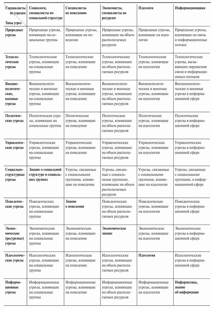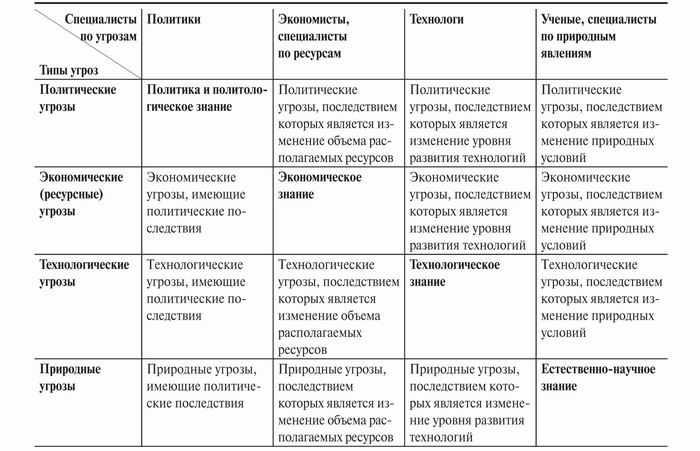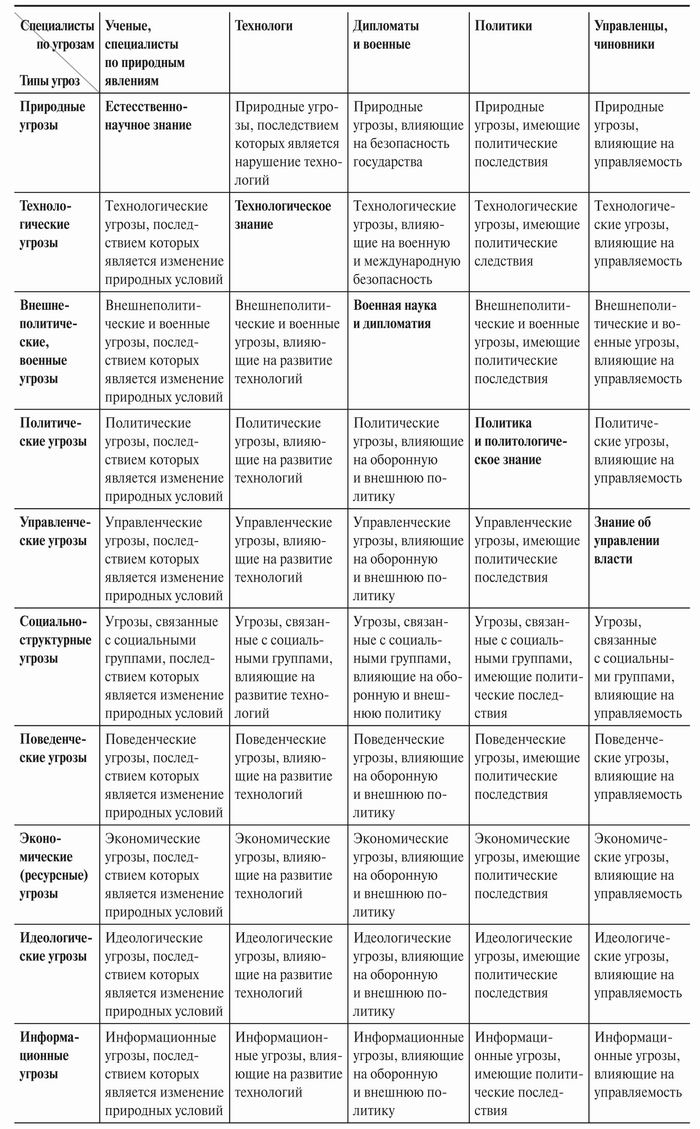 С другой стороны, в поле видения другого специалиста-предметника (столбцы табл. 3), например «политика», находятся виды угроз, относящиеся ко всем их типам (четвертый столбец табл. 3): от «природных угроз, имеющих политические последствия», до «угроз, связанных с социальными группами, имеющих политические последствия». Такие специалисты, в том случае если они достаточно авторитетны, могут инициировать направленный на руководство государства информационный поток, содержанием которого станет обоснование необходимости нейтрализации нового вида угрозы. Так произошло, например, когда политики обратили внимание на содержание информационного пространства и сочли, что это содержание представляет угрозу общественной безопасности и морали.