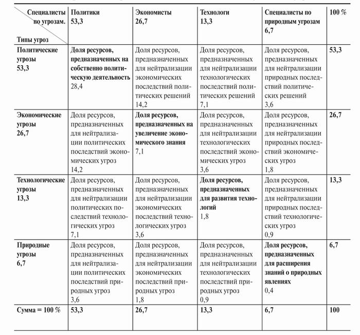 Обращаем внимание, что рассматривается общий объем ресурсов, выделяемых на нейтрализацию типов угроз. Теперь предстоит рассчитать относительное количество ресурсов, которые должны быть освоены при нейтрализации видов угроз, обозначенных клетками таблицы. Количество ресурсов, осваиваемых на собственно политическую деятельность, то есть диагональный элемент таблицы, образованный отношениями между строкой «политические угрозы» и столбцом «политики», должно составлять 53,3 % от 53,3 %, (28,4 % от всего располагаемого объема ресурсов в 100 %), то есть соответствовать ранжированию типов угроз, проведенному экспертами.