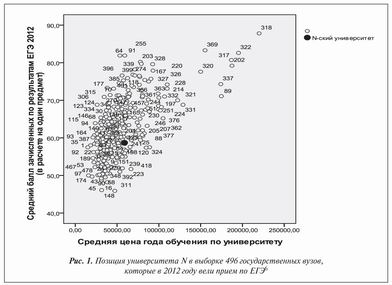 Рис. 1. Позиция университета N в выборке 496 государственных вузов, которые в 2012 году вели прием по ЕГЭ[6]
