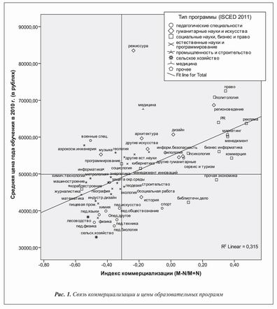 В-третьих, университеты получили право брать со студентов плату за обучение; появилась возможность создавать негосударственные вузы, полностью финансируемые из этого источника. Так называемые платники также концентрировались в привлекательных специальностях, на которые существовал наибольший конкурс. Рисунок 1 демонстрирует возникшие при этом связи[13]. По вертикальной оси отложена средняя цена года обучения на разных специальностях в 2010/2011 учебном году, а по горизонтальной — «индекс коммерциализации», то есть отношение разности платных и бюджетных мест к их сумме, которое может варьировать от 1 (если все места платные) до минус 1 (если все места бюджетные). Очевидна сильная связь между ценой и коммерциализацией: чем выше потенциальная прибыльность программы, тем больше доля внебюджетных мест, предлагаемых вузами. Рисунок также дает представление о характере доминирующей мотивации среди студентов. Лидируют социальные науки, привлекательные и для профессиональных, и для мораториальных студентов, — особенно же для тех, кто не хочет признаться себе и другим в принадлежности к мораториальному типу. На другом полюсе находятся неперспективные и трудоемкие сельскохозяйственные, педагогические (особенно связанные с преподаванием естественных наук или технических дисциплин в среднем профессиональном образовании) и, отчасти, инженерные специальности. Один фактор уравновешивает другой: социология с ее сомнительными карьерными перспективами находится в ценовом выражении неподалеку от программирования, в котором не обойтись без скучной и мудреной математики. Исключение из правила составляет только медицина.
