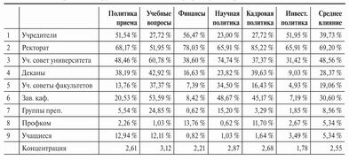 Влияние разных групп в университетской политике варьирует в зависимости от характеристик их экономической базы. Во время опроса респондентов просили также оценить роль девяти разных инстанций (учредителей, ректора и его заместителей, ученого совета университета, деканов, ученых советов факультетов, заведующих кафедрами, групп преподавателей и учащихся) в шести ключевых сферах университетской жизни, как то: прием, содержание учебных программ, распределение денежных средств, научная, кадровая и инвестиционная политика. Таблица 2 показывает, как эти инстанции влияли на перечисленные сферы.