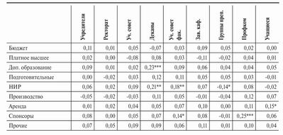 Здесь связей становится значительно меньше. Значимость деканов возрастает в тех вузах, для которых наиболее существенным источником доходов является дополнительное образование, — поскольку программы ДПО жестко привязаны к конкретной дисциплине, а их открытие и лицензирование зависит от усилий профильных факультетов. Доходы от научно-исследовательской работы также повышают вес факультетских структур — деканов и ученых советов, — с которыми могут повседневно контактировать и в которые могут избираться ведущие ученые. Отметим в заключение, что значимые корреляции с доходами от НИР сохраняются и для чисто коммерческих вузов (таблица не приводится), несмотря на то что сами эти доходы незначительны: даже небольшие поступления от НИР улучшают положение преподавателей-космополитов, которые эти поступления обеспечивают.