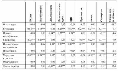 Мы видим несомненный дисбаланс власти: влияние ректоров ощущалось в 70 % всех возможных случаев, а профкома — лишь в одном случае из 20[18]. Отчасти распределение полномочий между инстанциями подчиняется функциональной логике — так, учредители отвечают за прием, инвестиции и иные стратегические задачи, но редко соприкасаются с учебным процессом и кадровой политикой, а профком участвует в кадровых решениях и влияет на связанные с ними финансовые вопросы, но не имеет отношения ко всему остальному[19]. Однако для наших целей более важна таблица 3, в которой приведены непараметрические корреляции Спирмена между ощущаемым влиянием разных групп на принятие решений и источниками доходов в бюджете данного вуза.