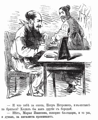 На светском рауте у Михаила Погодина 1 ноября 1848 года Сергей и Константин Аксаковы оба были в зипунах и с бородами. Приятель Ивана Аксакова Павел Годейн, увидев их в таком виде, «совершенно сошел с ума». В середине 1840-х годов славянофил Алексей Хомяков произвел сильное впечатление на московский бомонд, начав появляться в московских и петербургских гостиных с бородой. Впервые со времен Петра I представители благородного сословия осмелились показаться в свете в традиционном виде. Свет встретил традиционализм Аксаковых бранью и едкими насмешками. В кампании приняли участие не только Белинский, Герцен и Огарев, но также Некрасов, Тургенев и даже сочувствовавший славянофилам Аполлон Григорьев. Дело кончилось изданием в апреле 1849 года специального императорского указа о запрете дворянам носить бороды. Реакция Сергея Тимофеевича Аксакова на это решение была весьма резкой. Он отправил Алексею Федоровичу Орлову, шефу жандармов, письмо, в котором сообщал, что если его ношение бороды в Москве предосудительно для дворянина, то они с Константином «закупорятся в деревне навсегда». Но все-таки Аксаковы вынуждены были сбрить бороды и дать соответствующую расписку полиции. Этого же потребовали и от Алексея Степановича Хомякова. Уехав в Абрамцево, отец и сын Аксаковы снова отпустили бороды[18].