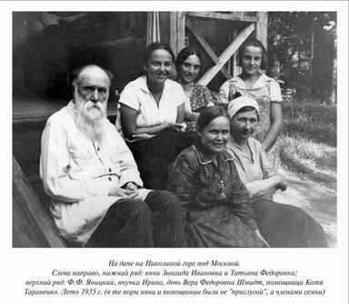 Через 12 лет, пройдя испытания революцией и Гражданской войной, фактически уже совсем из другого мира, Ф. Ф. снова пишет дочери: «Я бесконечно радуюсь, что ты осознала по существу важность психических явлений в мире вообще и отдалась их изучению в сфере педагогической. Психизму отдаешь подобающее, первенствующее место и, таким образом, ты являешься участницей в новом строительстве школы на началах психологических. С моей точки зрения такой поворот в школьно-педагогическом деле, если он будет удачно выдержан, составит эру. На этом поприще от души тебя приветствую, горячо поддерживаю и желаю всемерного успеха. Ведь пора — давно пора и в науке, и в жизни выдвинуть психологические явления на первое место, дать широкое освещение всех явлений и фактов жизни — в широком масштабе, — а в крайнем случае на первых порах хотя бы явлениям человеческой жизни — началам психологическим. До сих пор и в науке, и в жизни мы не чувствуем духовного начала, мы потеряли душу, и нам во что бы то ни стало надо ее найти и вернуть... Тогда только пойдет все по-другому, к лучшему. Это я чувствовал с молодых лет, и с покойной мамой твоей мы были в этом вопросе единомышленники. К слову сказать — проведение всюду психологического начала должно, по-моему, принадлежать главным образом женщине через школы, ибо мое глубокое убеждение — школы всех низших и отчасти средних ступеней должны принадлежать женщине, это ее сфера деятельности, ее царство, она должна быть проводником нового духовного начала жизни» (21.03.1921).