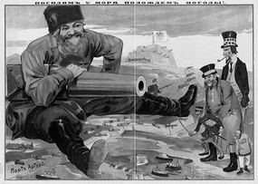 Замечательно, что в тексте «Варяга» столь откровенно разыгрывается «желтая карта», вброшенная в геополитическую колоду германским императором Вильгельмом II. «Патриотическая» Россия охотно с ним согласилась. Бесчисленные «народные картинки» на разные лады очерняли японцев, представляя их то в виде отвратительных монстров, то в виде слабых, хилых и истеричных созданий[3]. В идеологическом дискурсе того времени за японцами твердо закрепляются определения «желтые, раскосые, коварные»[4]. Расовые предрассудки распространялись даже на японскую одежду. Последний посол Российской империи в Японии Д. Абрикосов свидетельствует: когда он облачился в кимоно, один из соотечественников осудил его за то, что тот носит «постыдную одежду желтой расы»[5].
