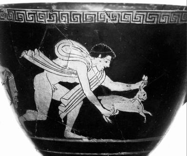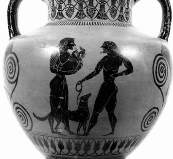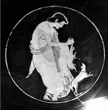 Начнем с последних. Когда Аполлон насылает мор на ахейский лагерь, его первыми жертвами становятся не люди, а мулы и собаки[16]. Близость собак и людей еще более очевидна в эпизоде, повествующем о погребальном костре Патрокла. Из него мы узнаем, что в стане Ахилла под Троей находилось девять собак: двоих он обезглавливает и сжигает на костре в честь Патрокла[17] вместе с конями, троянскими юношами, а также овцами и волами. Здесь важно обратить внимание на следующую деталь: собаки называются «столовыми» (trapezh`e kuvne, 23.173), иными словами — кормящимися со стола своего хозяина. Такие собаки живут и во дворце троянского царя Приама, выполняя роль стражников[18].